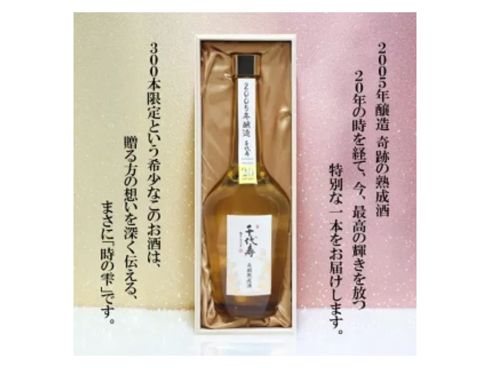 2005 年釀造,歷經二十年的熟成,這款純米吟釀展現千代壽對米香的極致詮釋。圓潤柔和的酒體,微堅果與熟果香交織,層次豐富,濃醇甘口,細膩卻不搶味。
